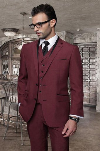 Бордовый оттенок смотрится благородно и со вкусом. В этом случае отлично будет смотреться костюм-тройка.