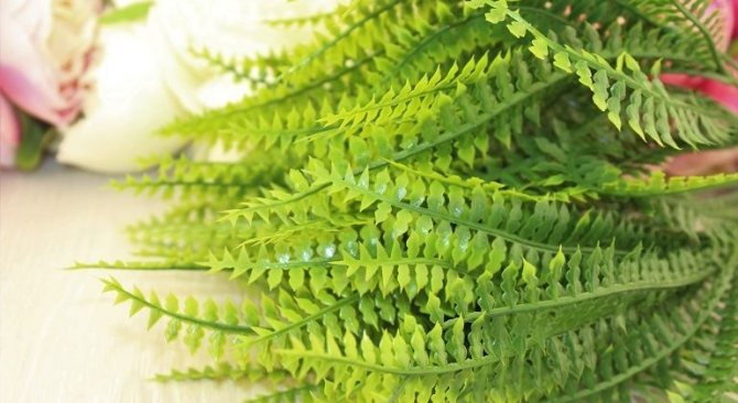 По изящности и красоте листьев ни одна трава или кустарник для флористики не сравняться с папоротником. Это пышная елочка для букетов, как часто ее называют в среде цветоводов. Более 200 сортов папоротника выращивается в цветниках и оранжереях с декоративными целями. Его узорчатые пышные веточки как нельзя лучше подчеркивают красоту разнообразных цветов. Свежесрезанный папоротник в любом букете смотрится презентабельно, это видно на фото, массово выставляемых в Сети. В односторонних композициях папоротник устанавливают на заднем плане, в округлых работах растение является своеобразной основой или поставкой для всех остальных растений. На языке цветов эта неприхотливая популярная зелень для букетов несет нотку очарования и искренности.