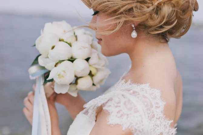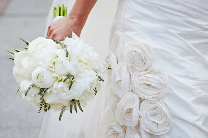 Белый букет невесты станет для молодоженов символом любви и благополучия, а также настоящим оберегом, который защитит влюбленных от сглаза. Чтобы закрепить эффект, предпочтительно использовать в композиции такие цветы как:
