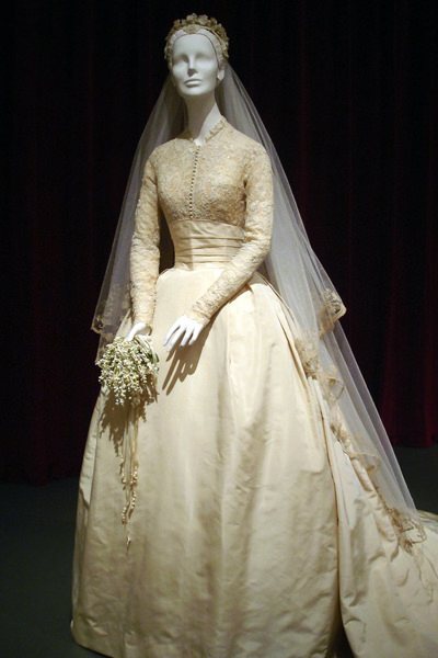 Не менее известный свадебный туалет звезды кинематографа США и княгини Монако Грейс Келли состоял из изысканного кружева и шелковой тафты. Их выкупил в музее сам жених, князь Монако Ренье II.