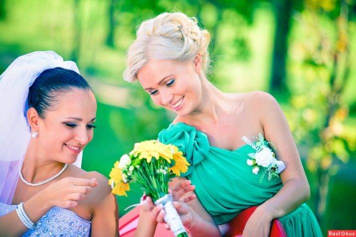 - Подружке нужно постоянно быть «палочкой-выручалочкой» для молодой: сопровождать ее в уборную, следить за ее макияжем и внешним видом убранства. Чтобы не допустить конфузных ситуаций, в сумочке девушки должны на всякий случай находиться запасные чулки, заколочки, салфетки, булавки и нитки с иголкой.