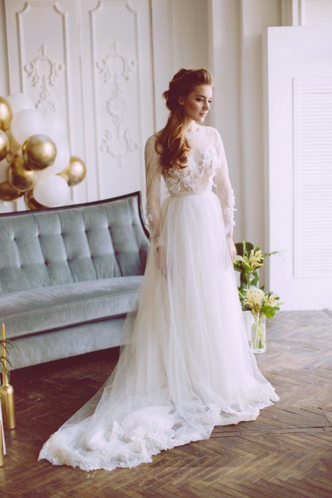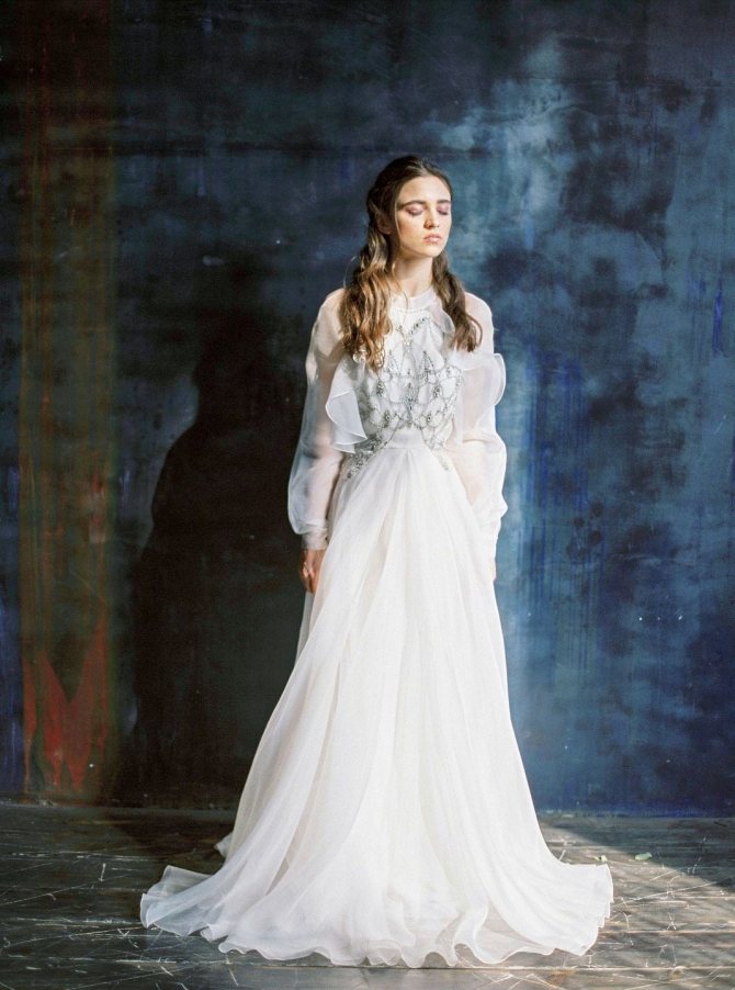Идеально подойдет романтичным невестам, которым близка стилистика викторианской эпохи. Объемные плечи, жемчуг и кружево, нарочито длинные ниспадающие рукава, воротники, многослойные прозрачные ткани — в этом сезоне винтаж выглядит как никогда роскошно и богемно.