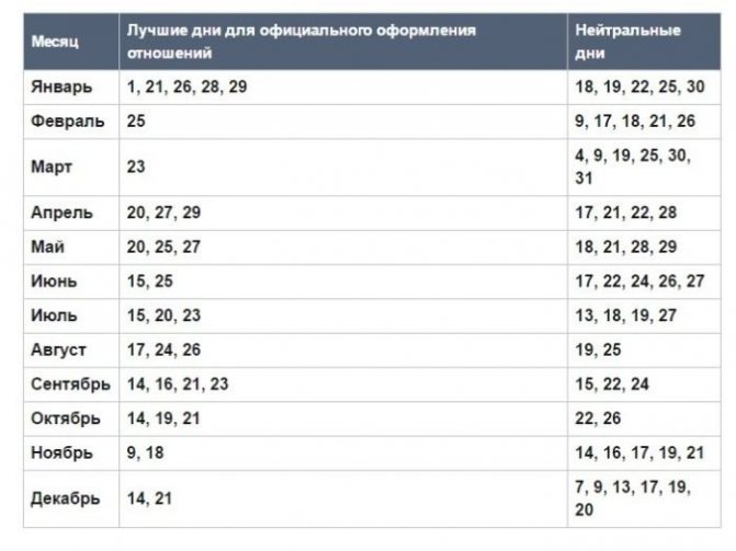 | Вторник | Благоприятный день | Молодожёны, которые узаконили свои отношения в этот день недели, будут обладать крепким здоровьем, им никакие недуги будут не страшны |