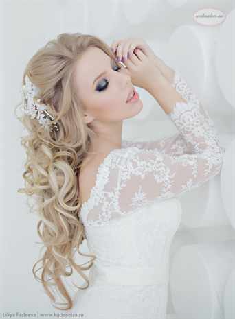 Дополнить прическу поможет фата, которая идет всем блондинкам, так как она подчеркивает нежность золотых прядей.