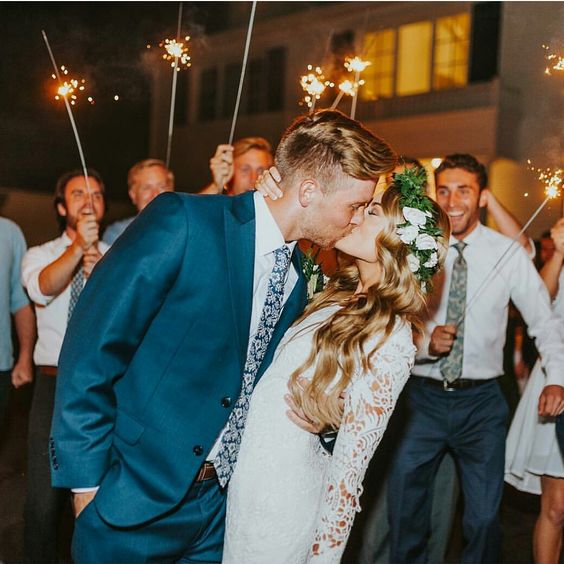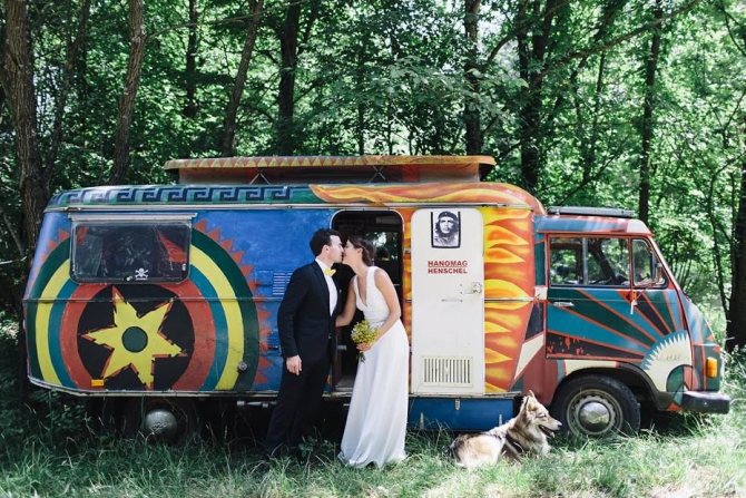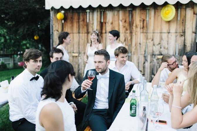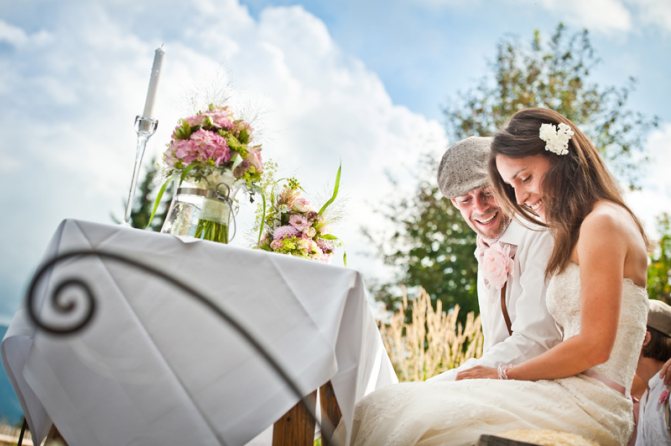 Свадьба в кругу близких людей часто проходит нестандартно. Под девизом «Меньше официоза — больше комфорта». Тем более, если вы выбрали выездную церемонию на природе, пышное свадебное платье с жестким корсетом прекрасно заменит летний сарафан любимого цвета невесты. Жених может отказаться от классических материалов для свадебного костюма в пользу легкого светлого льна.