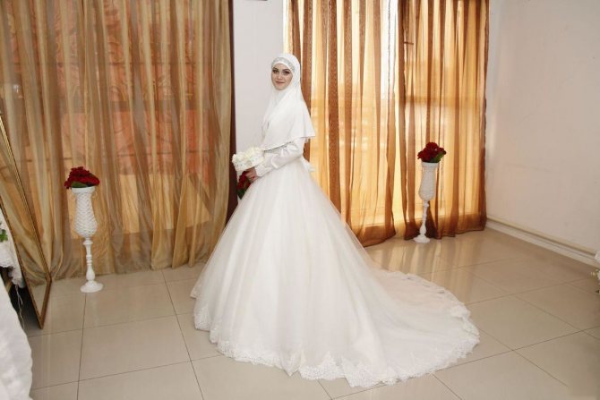 Свадебный наряд мусульманской невесты не должен быть облегающим, но слегка очертить силуэт не запрещается.