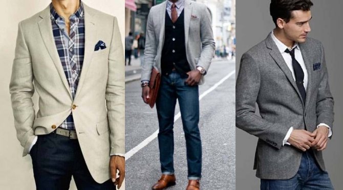 Комбинированный костюм, в котором рубашка, брюки и пиджак в разных оттенках, но при этом сочетаются между собой. Рубашка такого набора может быть как однотонной, так и с принтом – в клетку или полоску. Обувь к костюму лучше всего подбирать тоже на контрасте, но в одном цвете с ремнем. Из аксессуаров лучше всего выбрать качественные часы, а, чтобы добавить красок – яркий нагрудный платок или бутоньерку. Это выбор людей с тонким вкусом.