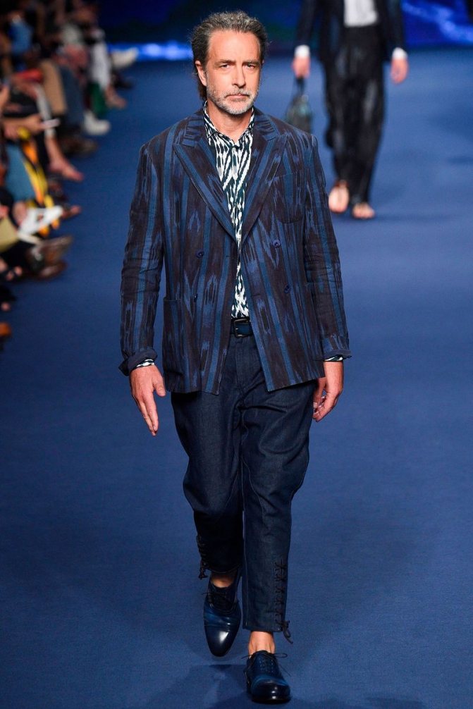 Деним – идеальный выбор для полуформальной вечеринки или прогулок с друзьями. Среди актуальных моделей джинсовых костюмов можно выделить пестрый пижамный стиль от Vivienne Westwood и Ports 1961 и привычные «варенки». В крое брюк и пиджака не придерживаются особых правил, поэтому в таком костюме легко встретить укороченные модели, объемные брюки с накладками, полноформатные варианты, слегка прикрывающие кроссовки.