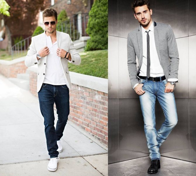 Игра на контрасте возможна, если надеть темные брюки или джинсы и светлый верх – пиджак на футболку или рубашку. Этот образ легко превратить в самый простой повседневный лук, поэтому, чтобы сделать его более праздничным, стоит добавить галстук или бабочку.