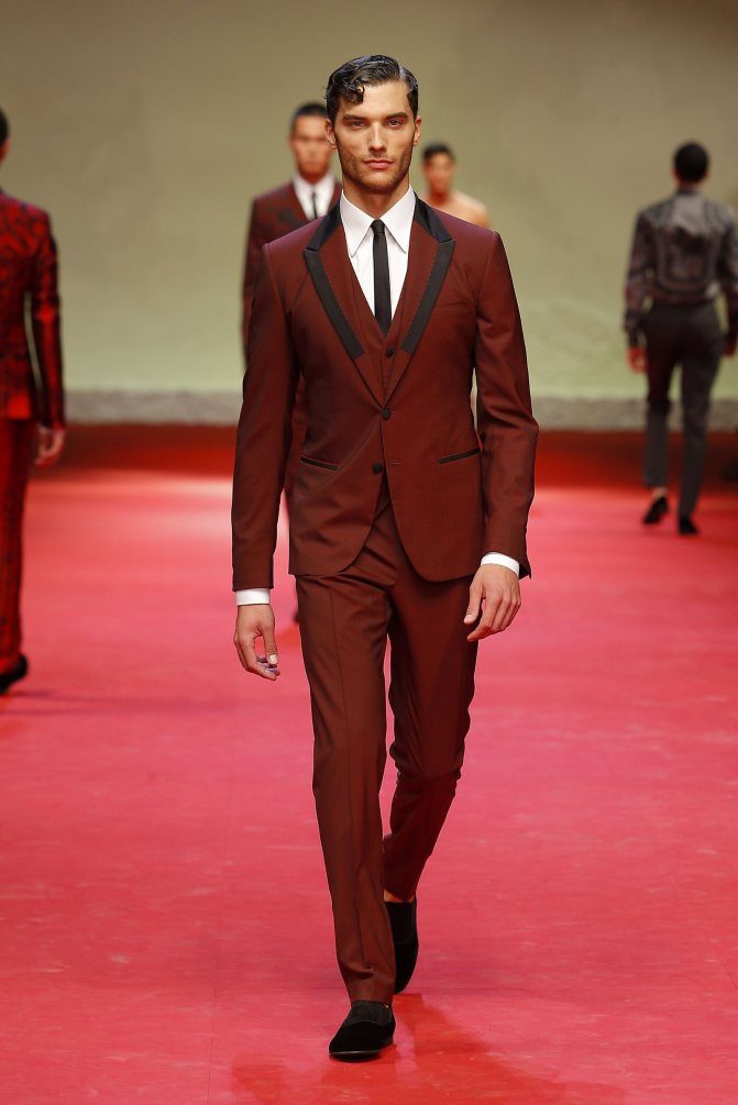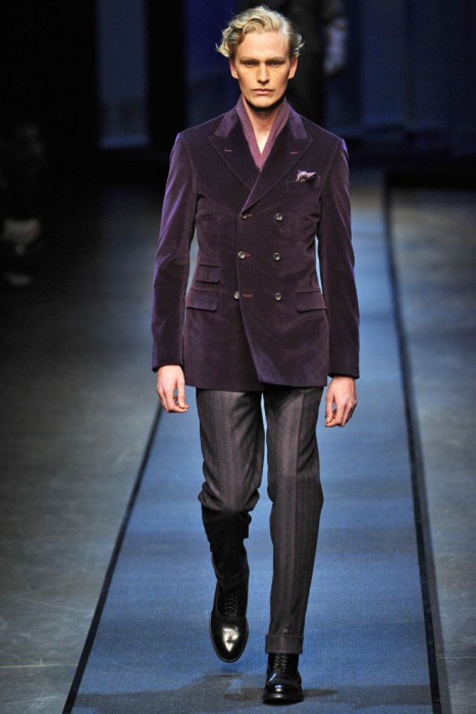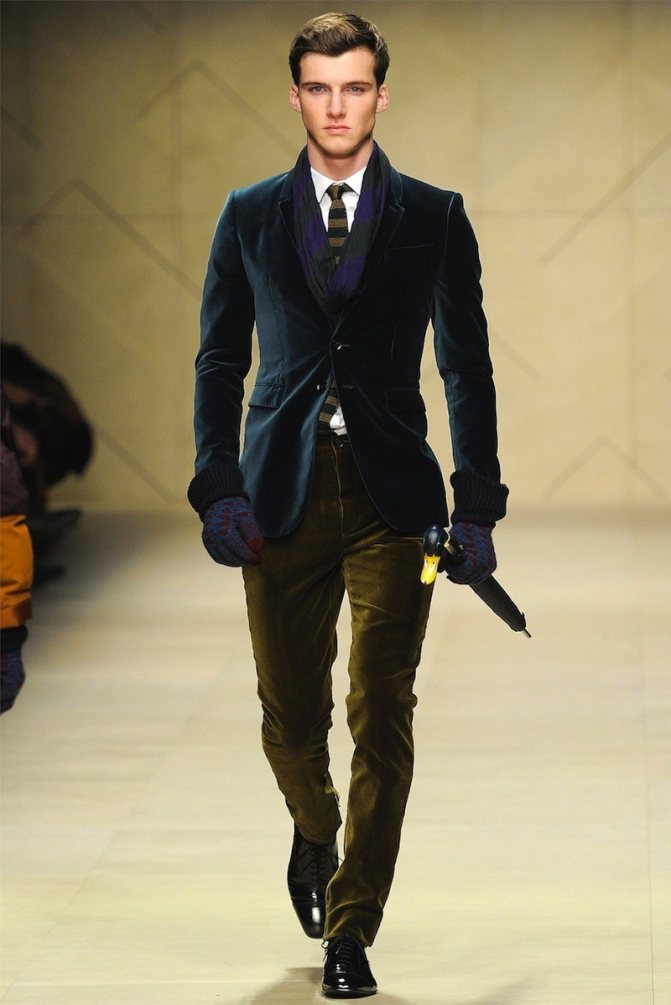 Дизайнеры предлагают не ограничивать себя темными оттенками, которые, безусловно, выглядят выигрышно и стильно. Мужчинам представили модели из зеленого, коричневого и фиолетового бархата. Такой костюм идеально впишется в вечерний лук и образы в стиле casual. Не бойтесь экспериментировать с этой капризной тканью и одевайте бархатные костюмы по каждому официальному случаю.