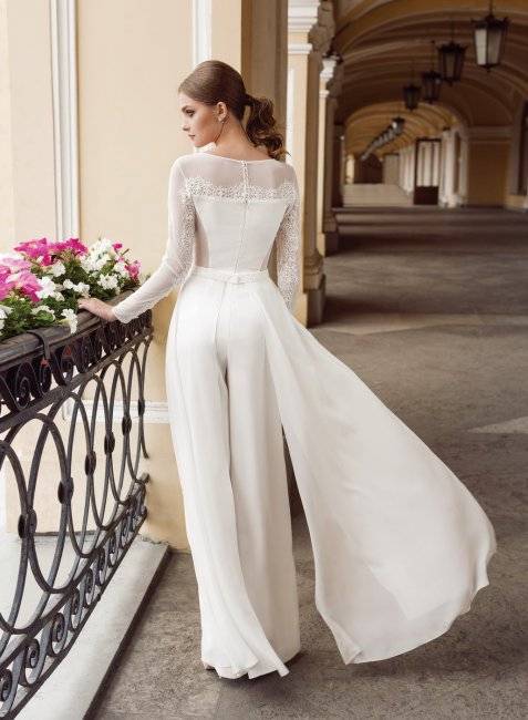 Часто комбинезоны дополняют шлейфами – эффектными, струящимися, придающими образу невесты изысканности и утонченности. Причем, они могут быть как пришивными, так и отстегивающимися, чтобы при необходимости этот элемент образа легко можно было снять, например, на время танцев и участия в конкурсах.
