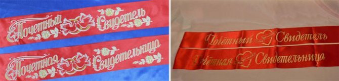 Многие молодожёны покупают своим свидетелям классические красные атласные ленты на свадьбу — это один из традиционных видов такого украшения, которое обычно сопровождается золотой надписью «Почётный свидетель» или «Почётная свидетельница». Современные свадебные салоны предлагают сегодня самые разные оттенки ленточек ¾ это и насыщенный индиго, и нежный розовый, и актуальный в этом сезоне лавандовый. Кстати, интересным вариантом является лента для свидетелей на свадьбу в виде триколора — она смотрится особенно торжественно.