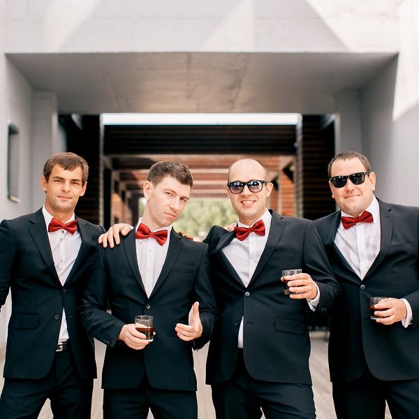 Жених и его друзья – это своеобразная команда, одежда которых может быть выполнена в похожем стиле или дополнена одинаковыми аксессуарами.