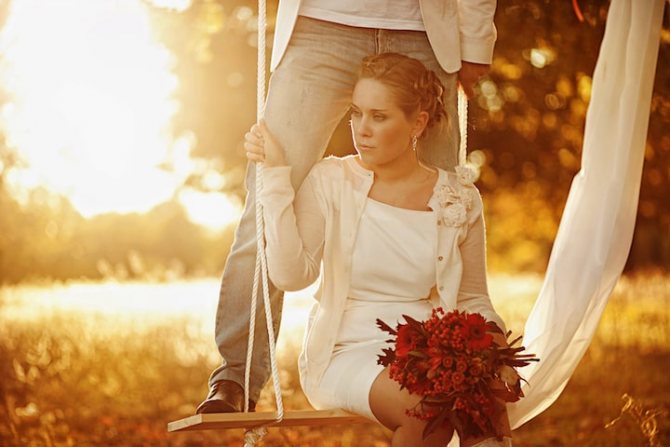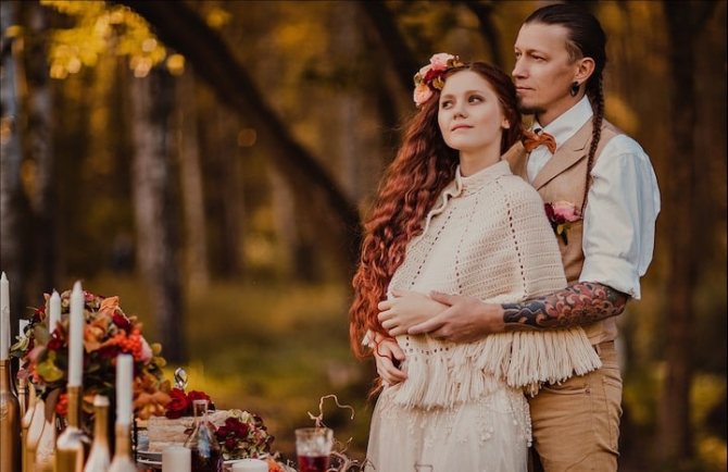 Не менее актуальный вопрос: что надеть супружеской паре на свадьбу? Ответ прост: образы должны гармонировать между собой. Например, как на фото: