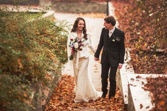 В моде смешение стилей, поэтому на свадьбу смело надевайте поверх платья кожаную куртку-косуху осенью!