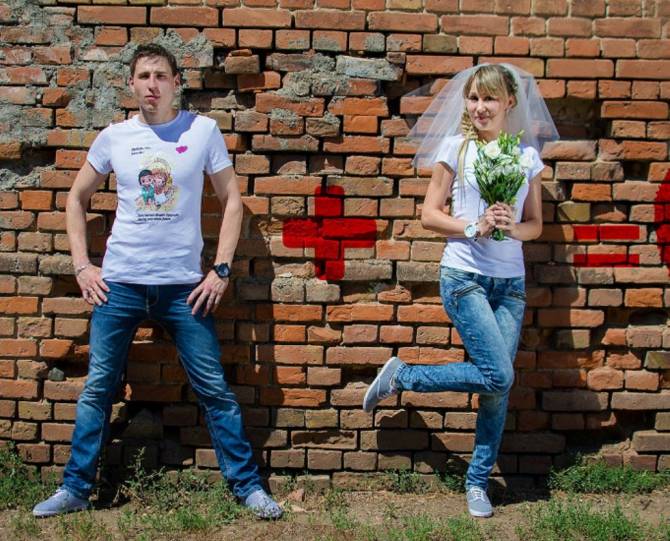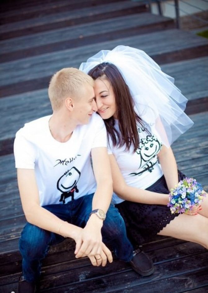 Этот вариант подойдет для тех, кто готов рисковать и любит эпатировать публику. На футболке может быть смешная тематическая надпись в тему происходящего торжества, или особое изображение, выступающее символом отношений брачующихся.