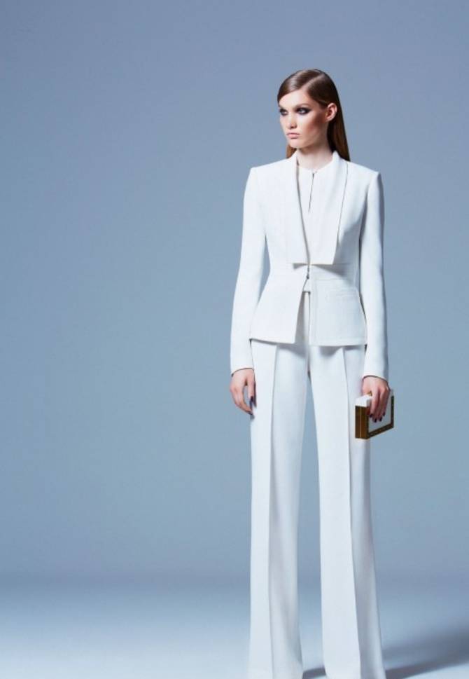 Данный наряд подходит для невест постарше. Хорошо смотрятся костюмы молочного и бежевого цвета с акцентированной линией талии. Брюки могут быть прямыми или расклешенными от бедра, блузку лучше подобрать из гладкой глянцевой ткани.