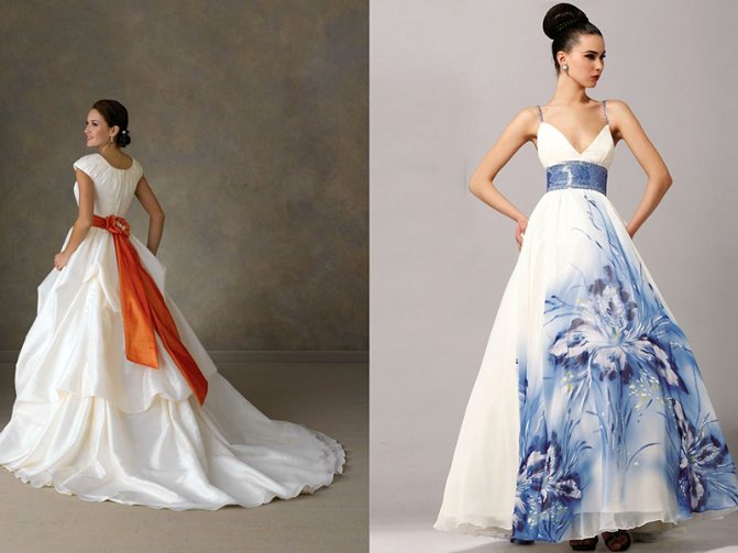 - платья белого цвета с цветными вставками, даже наличие одной детали – яркого широкого пояса на традиционном платье – уже делает наряд необычным;
