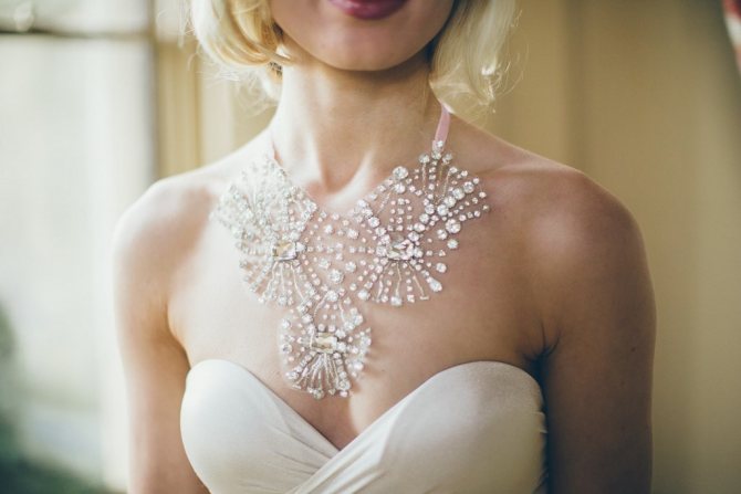 - Эксперименты с корсетом. Платья с глубоким декольте неприличны на венчании. Открытый наряд дополняют накидками или болеро из кружева или шифона. На церемонию прикрывают плечи болеро с длинными рукавами.