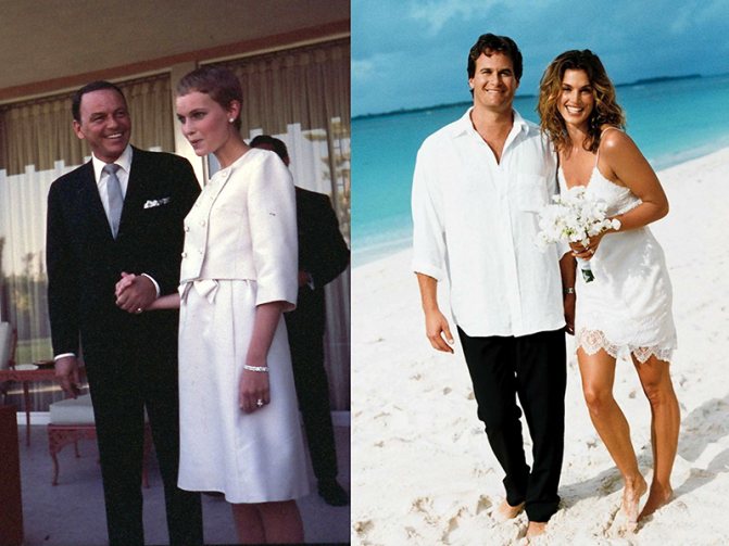 Весьма скромное белое платье с жакетом надела на свою свадьбу и актриса Миа Фэрроу. Очень простой свадебный наряд, напоминающий пляжный сарафан, был в день свадьбы на модели Синди Кроуфорд.