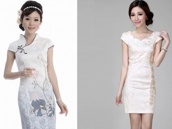 Весьма оригинально будет выглядеть скромный свадебный наряд в китайском стиле. Конечно, совсем не обязательно полностью копировать национальную одежду и облачаться в красный шелк. Но вот «позаимствовать» некоторые детали аутентичного наряда вполне возможно. Для этого стоит сшить платье из шелка или атласа, сделать рукава в форме крылышек и воротничок-стойку. Длина платья может быть разной, оригинально смотрятся и длинные платья в китайском стиле, и укороченные модели до колен.