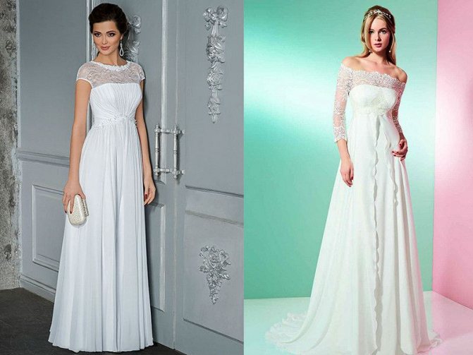 Скромно и романтично выглядят модели в стиле ампир. Это воздушные платья из легких тканей с подрезом под грудью и слегка расклешенной юбкой. Такой фасон хорошо подходит для полных невест и невест, ожидающих малыша. Впрочем, и юные стройные девушки смотрятся в платьях в стиле ампир очень женственно и мило.