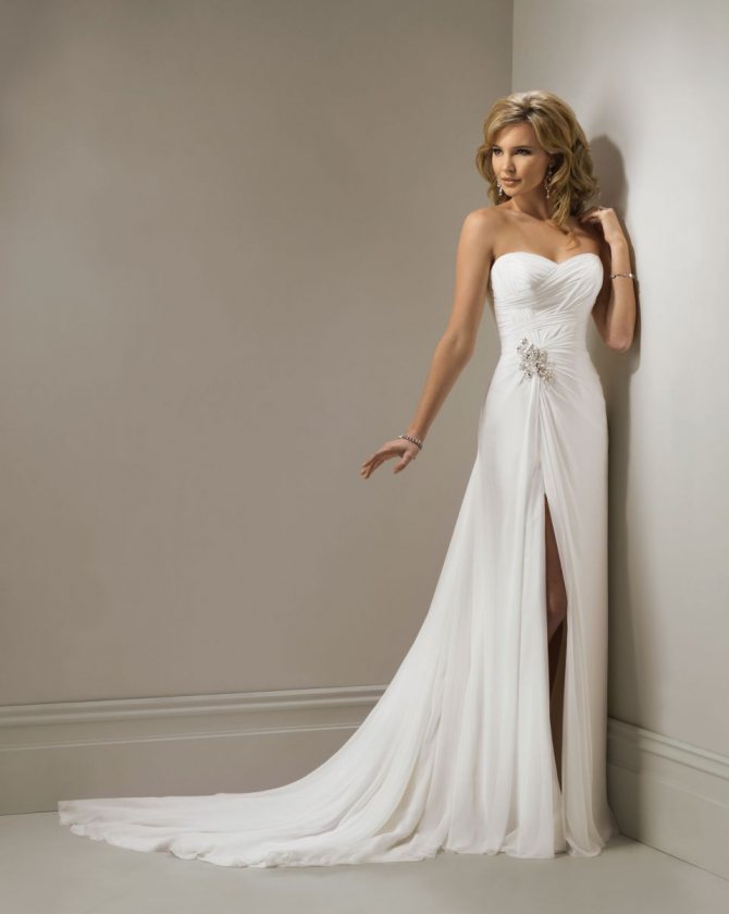 Еще один вариант модели с высоко расположенной линией талии – это платья в греческом стиле. Их отличием является ниспадающая складками юбка и отсутствие рукавов. В таком наряде невеста будет похожа на античную богиню.