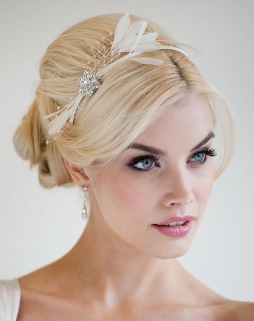 Ярко дополнит свадебный стиль невесты ободок, лента или заколка, украшенные крупными элегантными аксессуарами. Такие свадебные украшения могут быть декорированы настоящими перьями, цветами из ткани и бусин, бантами, композицией из цветочных букетов или камней.