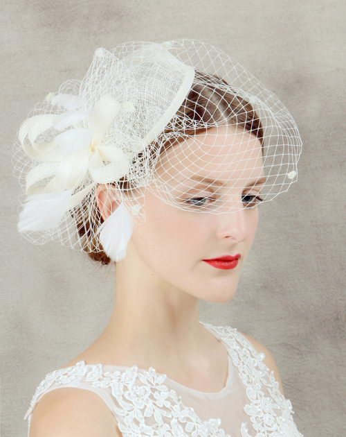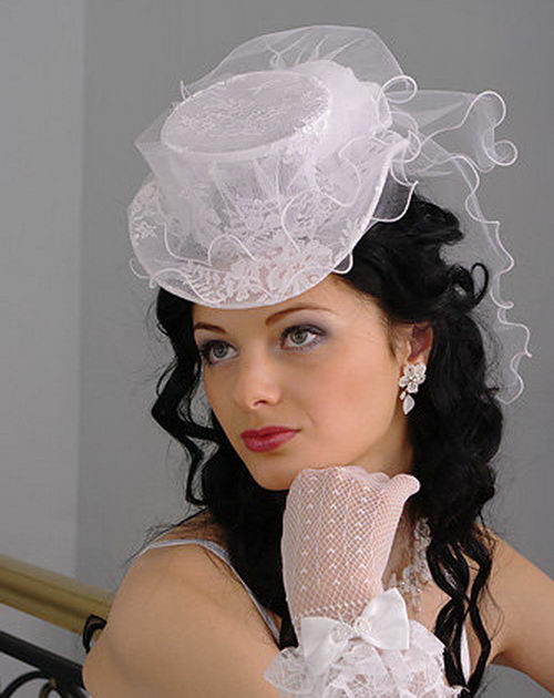 Шляпки с вуалью могут быть изготовлены в виде крупных цветов, иметь овальную и круглую форму. Они легко крепятся на прозрачном гребне к волосам невесты. Сами головные уборы могут быть миниатюрными, необычной формы или с крупными полями.