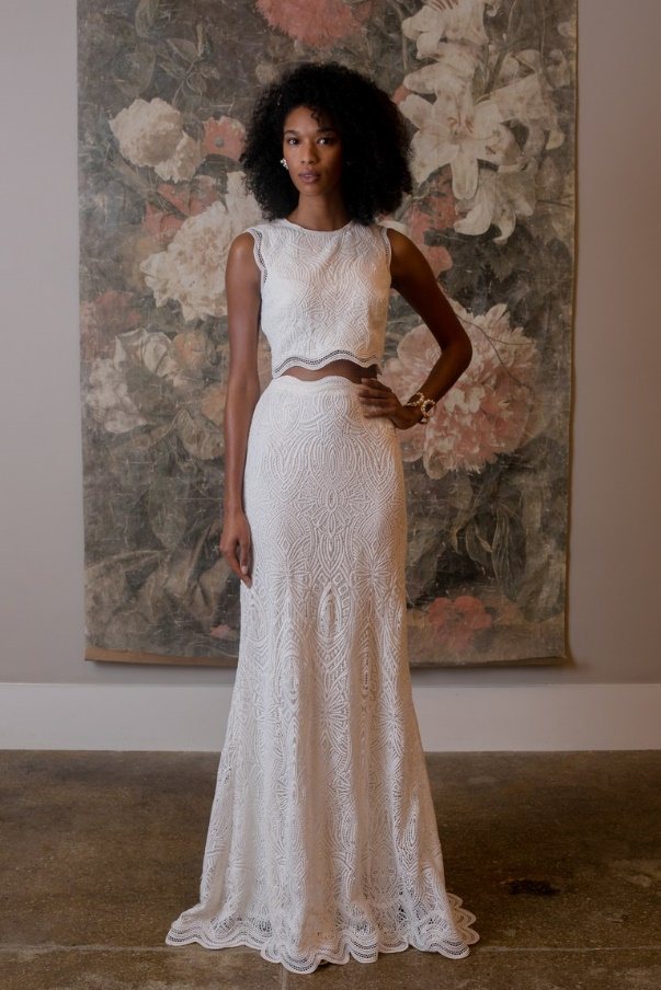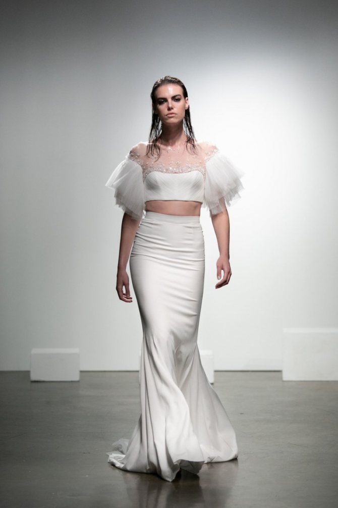 И старый и новый свет добавили в свои коллекции раздельные свадебные туалеты – топ в сочетании с юбкой. По силуэтам есть разнообразие – рыбки, годэ, а-силуэтные варианты. Много минималистичных вариантов, но сохраняются и кружевные модели.