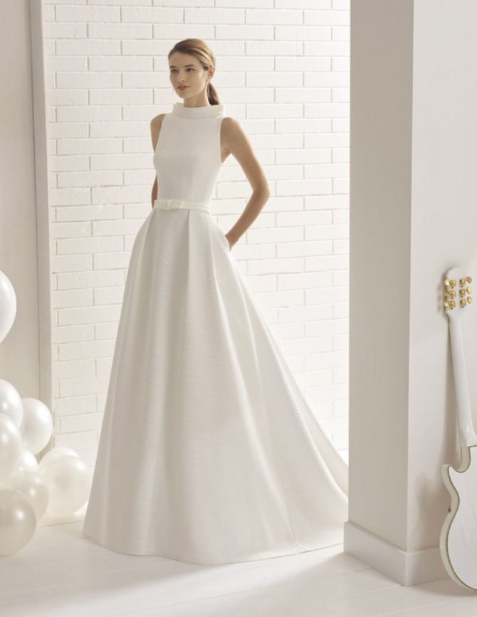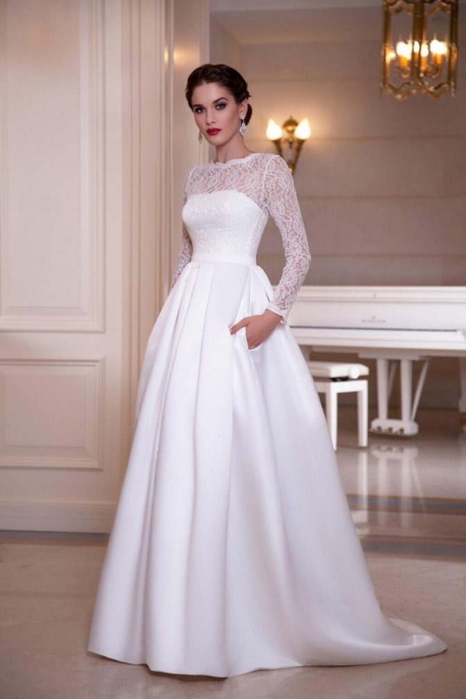 Изюминка наряда такого плана кроется в его скромности и конечно в основном платья и костюмы такого фасона будут особенно популярны в тех семьях, в которых запрещается во время свадьбы демонстрировать область декольте, шеи.