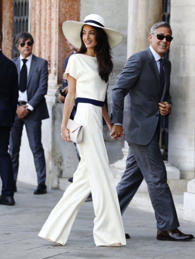 Смелый и экзотичный для наших широт наряд, но на западе он уже давно практикуется. Так, например, в одном из таких брючных костюмов выходила замуж нынешняя жена Джорджа Клуни Амаль.