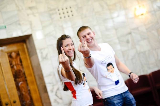 - Для пары, которая желает, чтобы их свадебные наряды были лаконичными и в то же время оригинальными, подойдет тренд, пришедший к нам из восточных стран. Там в доказательство того, что девушка и парень состоят в серьезных отношениях, принято на свадьбу надевать одинаковую одежду. Так что парные футболки и джинсы вполне могут сгодиться в качестве альтернативы платью и фраку.