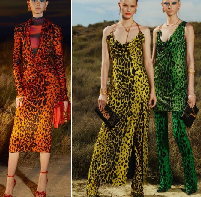 Тренды: леопардовый рисунок ткани, аппликации из каменьев и вышивки, широкий кожаный ремень, драпировка, вырезы, чокеры и броши из металла:
