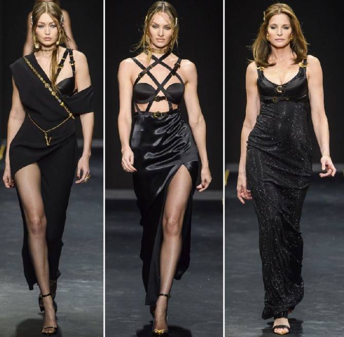 Тренды: платье с глубоким вырезом, надетое поверх водолазки или поверх брюк, высокий боковой разрез, бретели-цепочки: