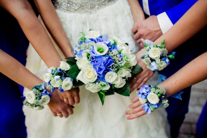 - Сочетание с оттенками наряда невесты или контрастные расцветки.