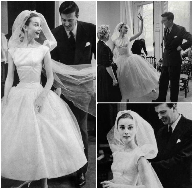 Свадебные наряды самой Одри были куда более удачными, чем ее браки. Оба официальных замужества актрисы закончились разводом. Первый раз Одри связала себя узами брака с известным голливудским актером Мелом Феррером. Их свадьба состоялась в Швейцарии в 1954 году и стала не только одним из самых ожидаемых событий в мире шоу-бизнеса, но и памятным моментом в истории моды. Эльфийский образ невесты придумал знаменитый французский кутюрье Пьер Бальмен. Возможно это белое платье длиной до щиколотки с воротником-стойкой, подчеркнутой талией и длинными шифоновыми рукавами не стало бы столь заметным явлением, если бы не милый венок из свежих цветов, украсивший голову невесты. Будь выбрана традиционная тиара с фатой или вуаль, образ не получился бы столь трогательным и романтичным.