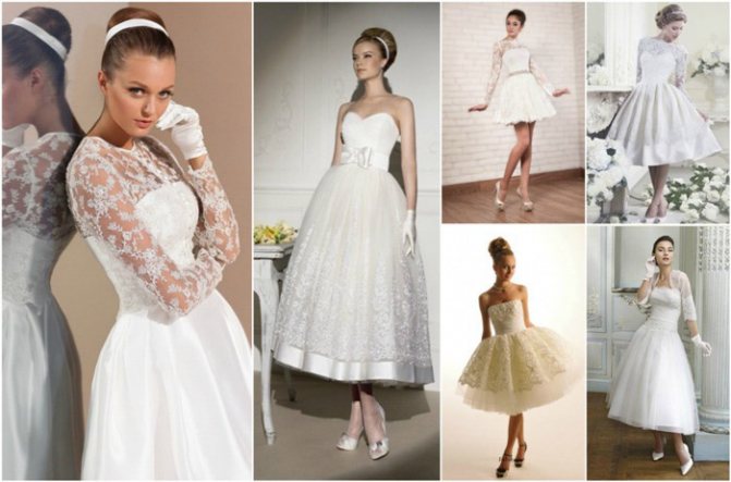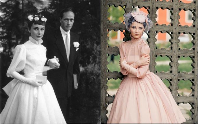 Если ваш выбор пал на свадебный наряд в стиле Хепберн, используйте классический ретро-стиль платья, которое выглядит так: пышная юбка по колено и скромный облегающий лиф с заниженной талией на тоненьких бретельках. Чтобы образ смотрелся дорого и со вкусом, используется натуральный мех. Он здесь может применяться в качестве ворота, а также как просто накидка на плечи. Для такого вечернего туалета предпочтительнее атлас, шелк, фатин, шифон или тафта. Дополнить образ следует небольшим количеством оборочек, кружева.
