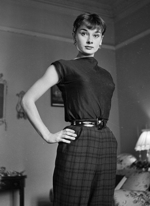 У каждой девушки сейчас в гардеробе есть укороченные брюки. А ведь это одни из любимых моделей брюк Одри. Она носила укороченные брюки (капри) облегающего кроя. В повседневной жизни у Одри был самый частый образ это укороченные брюки и джемпер. Ведь согласитесь, это и сейчас самый удобный и практичный образ. Брюки обычно были темных цветов. А в качестве обуви были туфли на плоской подошве по типу балеток.