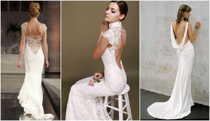 Другой вариант свадебного туалета – это фасон «трапеция» или платье-футляр. В данном случае юбка начинается от линии груди и имеет короткую длину (возможен и вариант в пол), топ выполнен с воротом-стойкой или американской проймой. Все максимально лаконично, скромно, но со вкусом. Такая модель платья подойдет для девушек неидеальных форм, которым необходимо подчеркнуть талию – их главное достоинство.