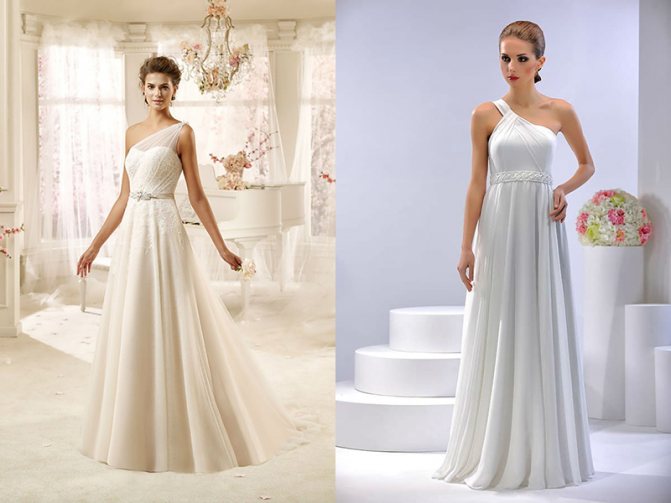 Так асимметричный вырез и бретель на одно плечо, украшенная крупной брошью – это отличный выбор для невест, имеющих фигуру типа «груша». Благодаря такому покрою платья, можно визуально сделать фигуру более гармоничной.