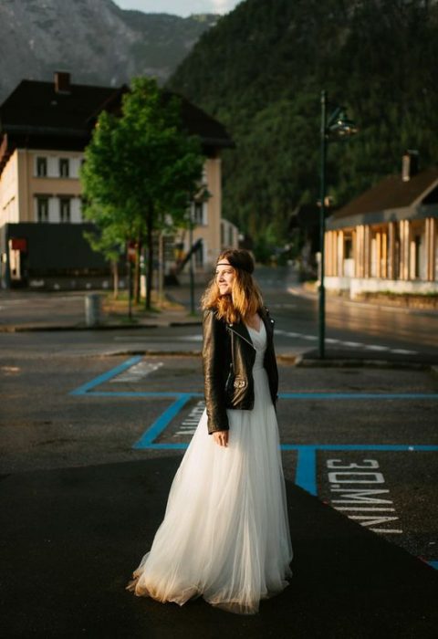 Идеальным стилем свадьбы для образа невесты с кожаной курточкой будет индустриальный стиль или минимализм.