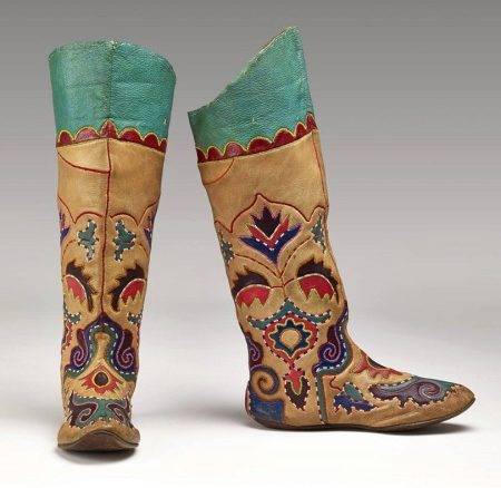 - Сапоги для летнего периода могли быть на каблуке. В старину носки шились загнутыми. Молодые девушки носили обувь с украшениями в виде аппликации и вышивок.