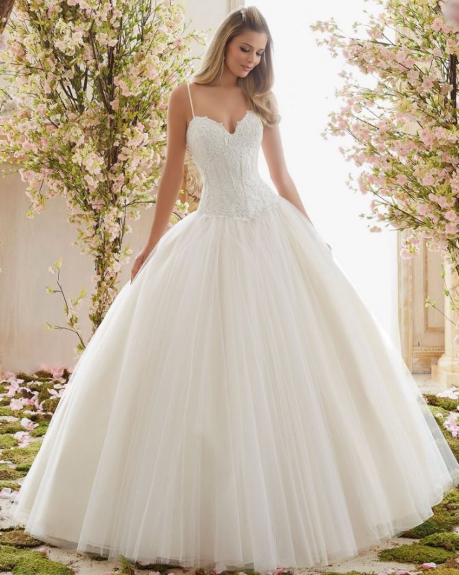 Обладательницам пышного бюста стоит отказаться от слишком откровенного декольте, чтобы не испортить нежный образ невесты. Крой предпочтителен летящий, без излишнего декора. Корсет должен быть достаточно жестким, чтобы он хорошо поддерживал грудь.