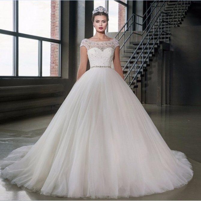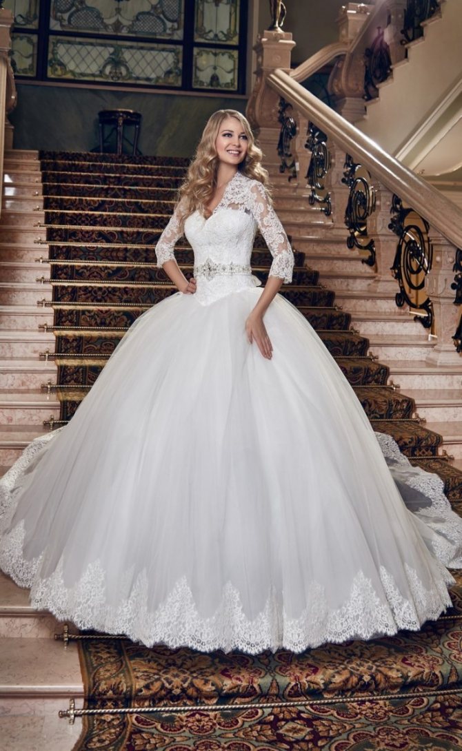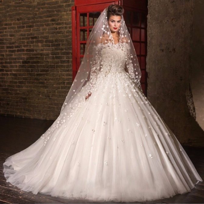 Платье невесты с открытым верхом и закрытыми руками будет хорошо сидеть на девушке практически с любой фигурой. Открытые плечи подчеркнут хрупкость и нежность невесты, а закрытые руки скромность и целомудрие.