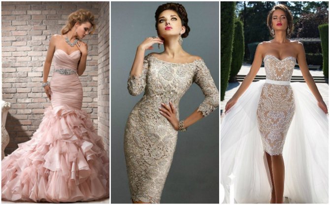 Одно из самых популярных облегающих платьев для свадьбы – это платье «Русалка». Такой наряд отлично подчеркивает тонкую талию, а мелкие недостатки фигуры легко скрывает. Минус такого платья состоит в том, что оно подойдет только тем девушкам, которые обладают стройной фигурой и высоким ростом.