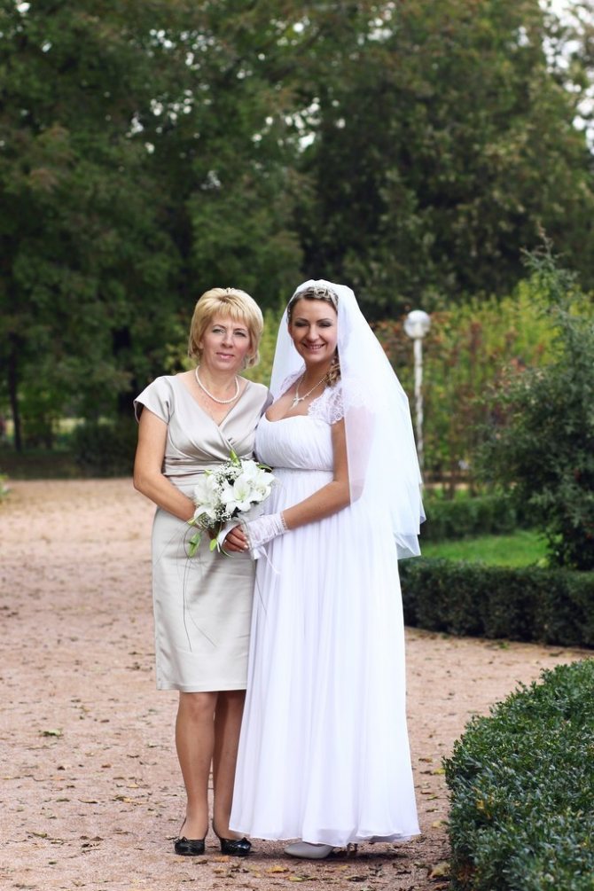 - Наряд матери должен быть элегантен, красив, но не ярче и лучше, чем у невесты. Платье надо выбирать торжественное, но не кричащее. Лучше если оно будет перекликаться со свадебным платьем дочери.