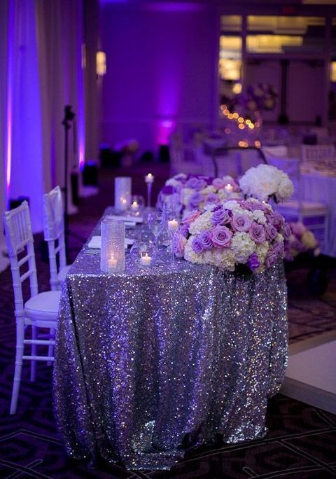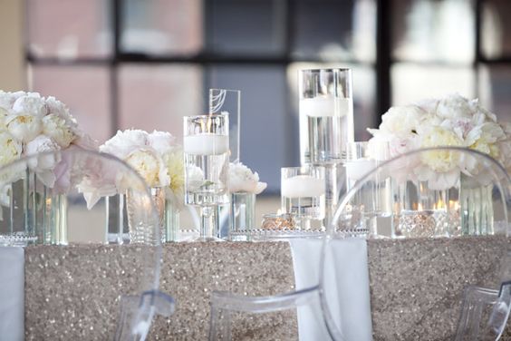 Столовое серебро, подсвечники, люстры, хрусталь, множество камней, серебряные кубки и подносы – вот главные участники декорирования банкета на свадьбе цвета серебра.