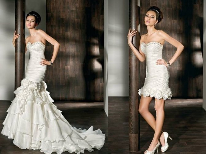 Но самый интересный и, то же время, практичный вариант платья – это модель-трансформер. В этом наряде юбка является съемной деталью. После окончания торжественной части мероприятия невеста может отстегнуть пышную юбку и остаться в облегающем платье. То есть, модель-трансформер – это платье «два в одном».
