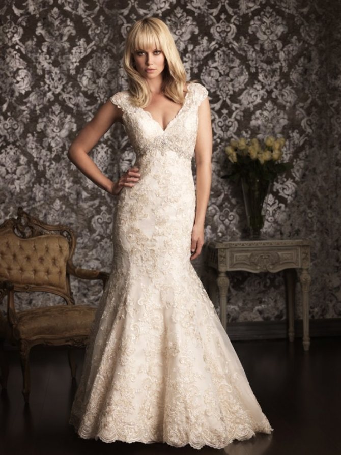 Высоким новобрачным с пропорциональной фигурой и небольшой талией. «Рыбка» визуально делает бедра объемнее и может легко прибавить лишние килограммы, а заниженная талия – укорачивает ноги, поэтому у невысокой полной девушки нарушатся пропорции тела, и она будет казаться громоздкой; Крупным барышням подойдет данный фасон только в том случае, если у нее пропорции гармоничны, она высокая и нет животика.
